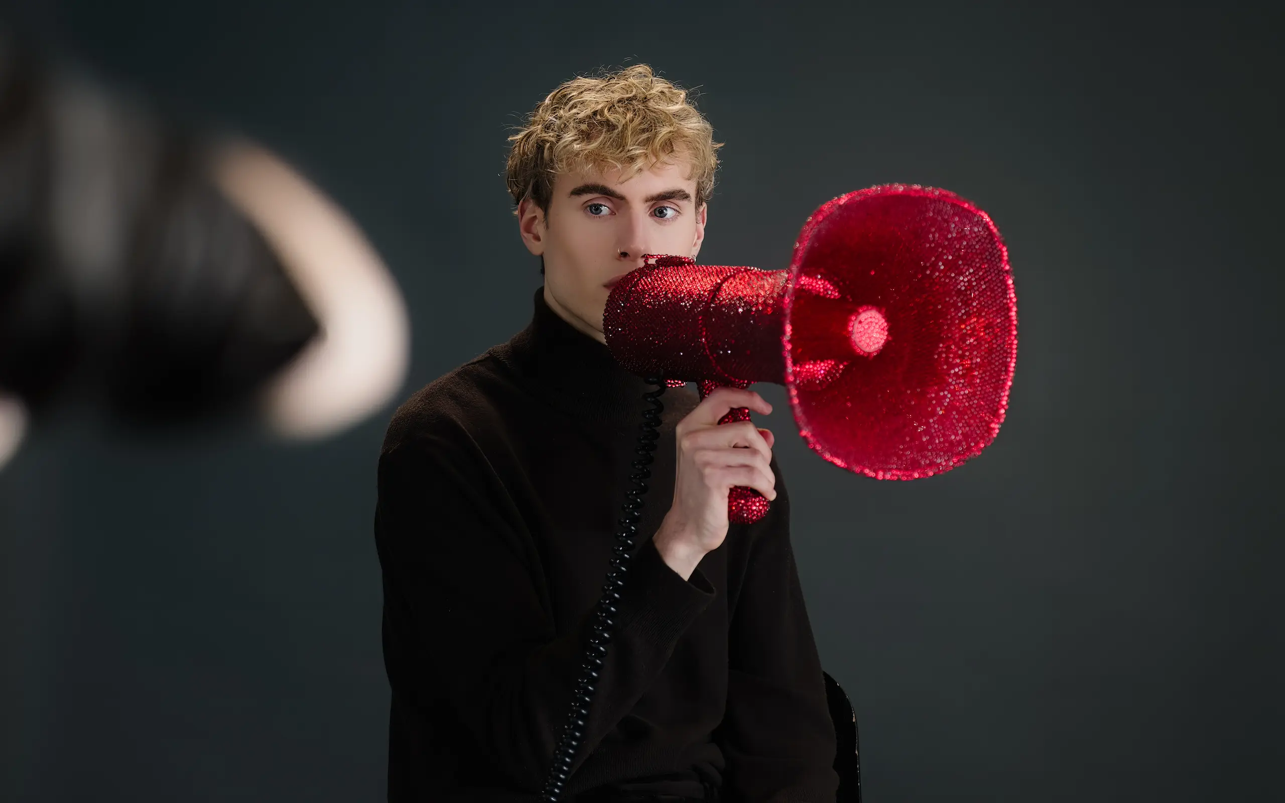 Elijah McKenzie-Jackson, a visual artist renowned for his work in painting and writing, debuts his latest sculpture, There's No Place Like Home. Adorned with 17,270 Swarovski crystals, this ruby megaphone symbolizes resilience and advocacy. Through a rare in-camera interview, he shares his beliefs and aspirations with sincerity and grace, reinforcing his role as a UN Youth Champion for Refugees.